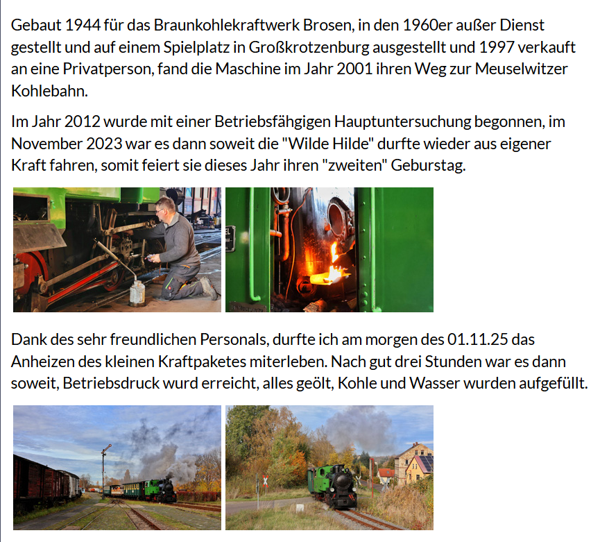 An 2 Wochenenden im September dampft unsere "Wilde Hilde" durchs ehemalige Braunkohlerevier im Leipziger Südraum. Erleben Sie bei einer Fahrt von Meuselwitz nach Regis-Breitingen Industriekultur hautnah. Schauen Sie unserem Dampflokpersonal über die Schultern und erfahren Sie einiges wissenswertes über Technik, Funktionsweise und den Eisenbahnbetrieb auf einer ehemaligen Grubenbahn.