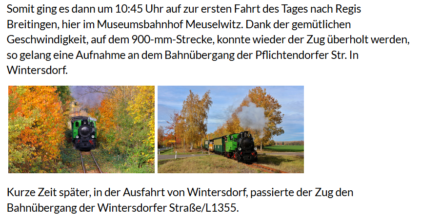 An regulären Fahrtagen laut Fahrplan startet unser Zug ab Wintersdorf nach Regis-Breitingen und zurück. Zwischen Meuselwitz und Wintersdorf haben wir weiterhin einen Schienenersatzverkehr eingerichtet. Der Bus startet in Meuselwitz am Bahnhofsvorplatz.